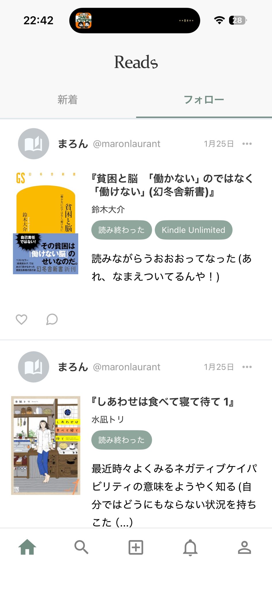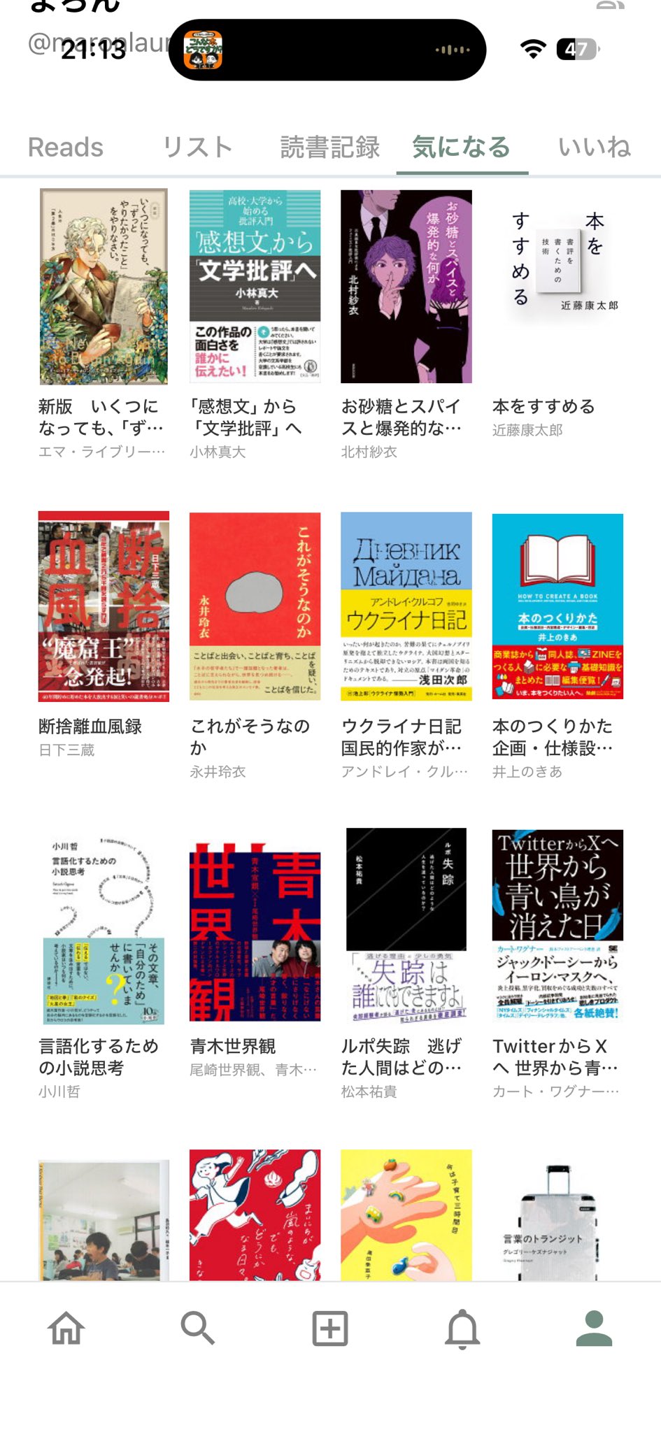 ReadsはSNSを名乗っているけど、別に「交流をしたければできる。しなくても別にいいよ」という感じなんですよね。わたしは通知を全部切っていて、ベル(通知)のタブを見に行かなければ見ることはありません。